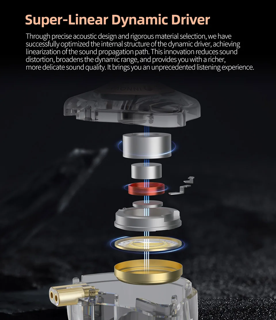 Through precise acoustic design and rigorous material selection, we have successfullyoptimized the internal structure of the dynamic driver, achieving linearization of thesound propagation path. This innovation reduces sound distortion, broadens thedynamic range, and provides a richer, more delicate sound quality. lt brings you anunprecedented listening experience.