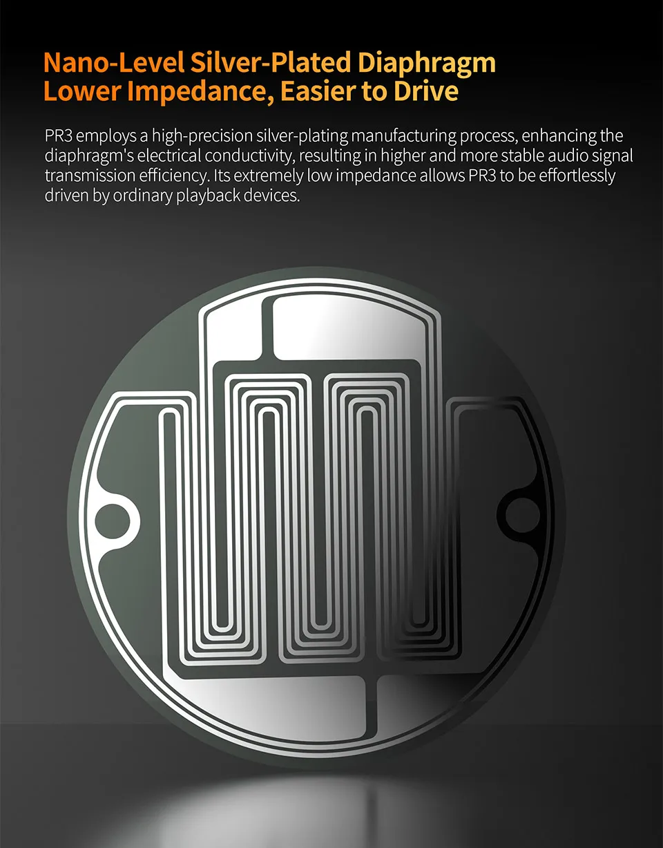 The high-precision silver-plating process enhances the diaphragm's electrical conductivity, ensuring higher and more stable audio signal transmission. With extremely low impedance, KZ PR3 effortlessly pairs with ordinary playback devices.