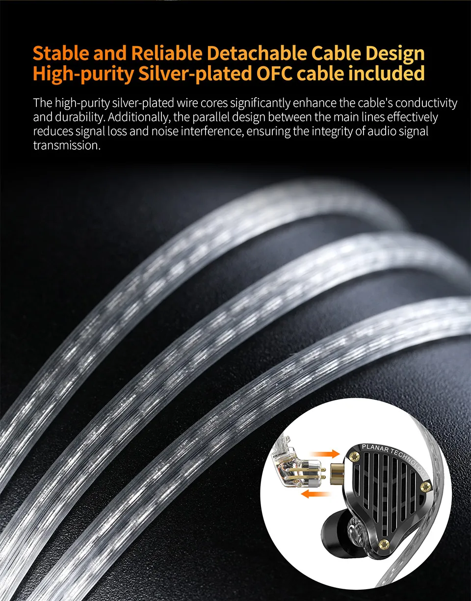 The detachable cable design ensures stability and reliability. The included high-purity silver-plated OFC cable enhances conductivity and durability, minimizing signal loss and noise interference for a pure audio experience.