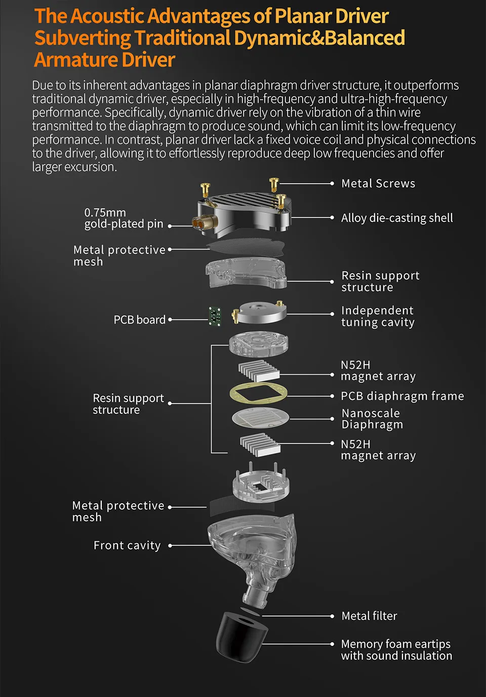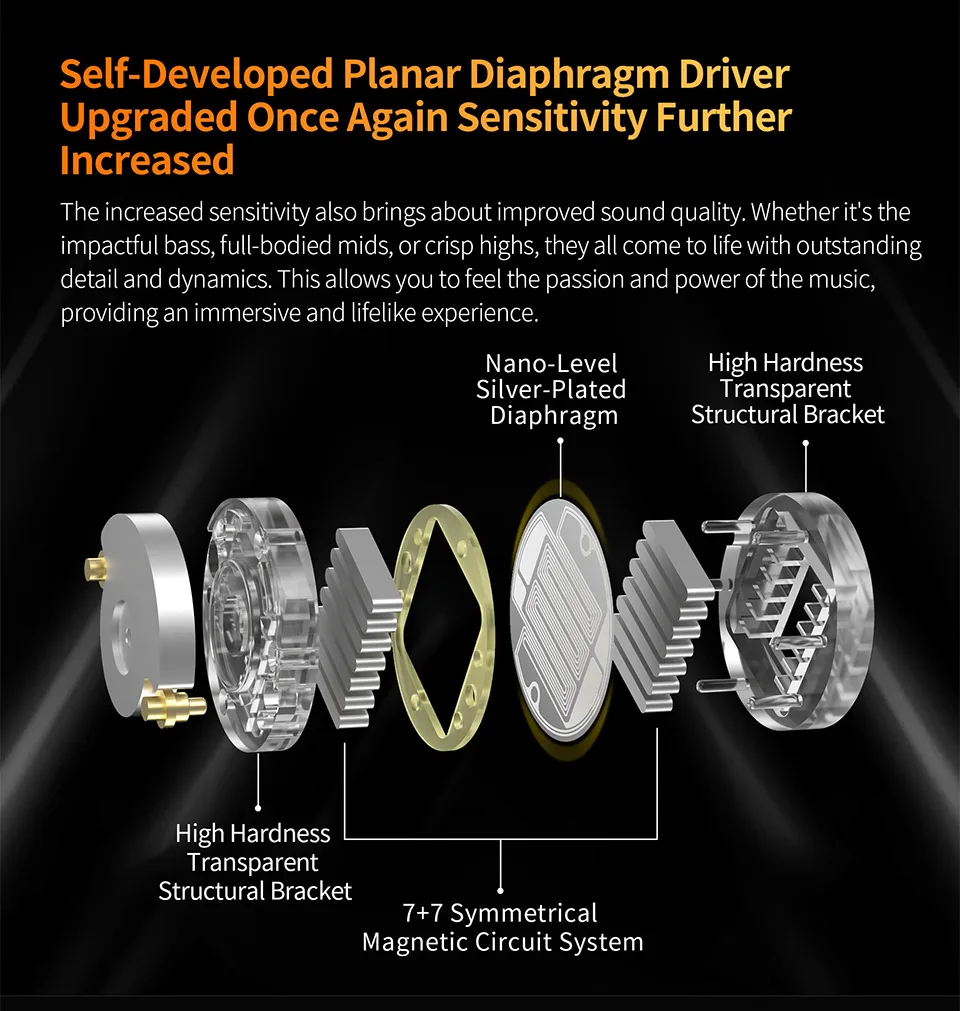 Our self-developed planar diaphragm driver, upgraded for increased sensitivity, delivers impactful bass, full-bodied mids, and crisp highs with outstanding detail and dynamics. Feel the passion and power of your music like never before.