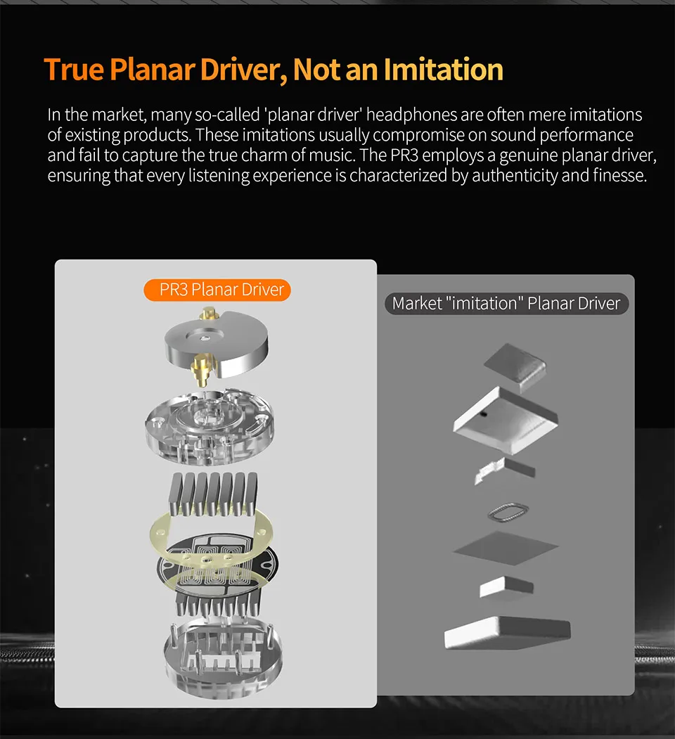 Featuring our in-house developed 13.2mm planar diaphragm driver, KZ PR3 stands apart from pseudo-flat earphones in the market. Embrace scrutiny, as we fear no disassembly or doubt, offering a true planar driver experience.