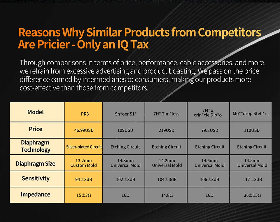 Avoiding unnecessary product boasting, KZ PR3 offers superior performance, cable accessories, and affordability. By eliminating intermediaries, we pass on the savings directly to consumers, making our product a cost-effective choice.