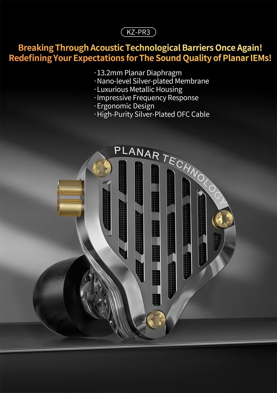 KZ PR3 redefines audio excellence by incorporating a genuine 13.2mm planar diaphragm driver, offering unparalleled advantages over traditional dynamic and balanced armature drivers. Planar technology's inherent structure outperforms in high-frequency and ultra-high-frequency ranges, providing a clear and immersive listening experience.