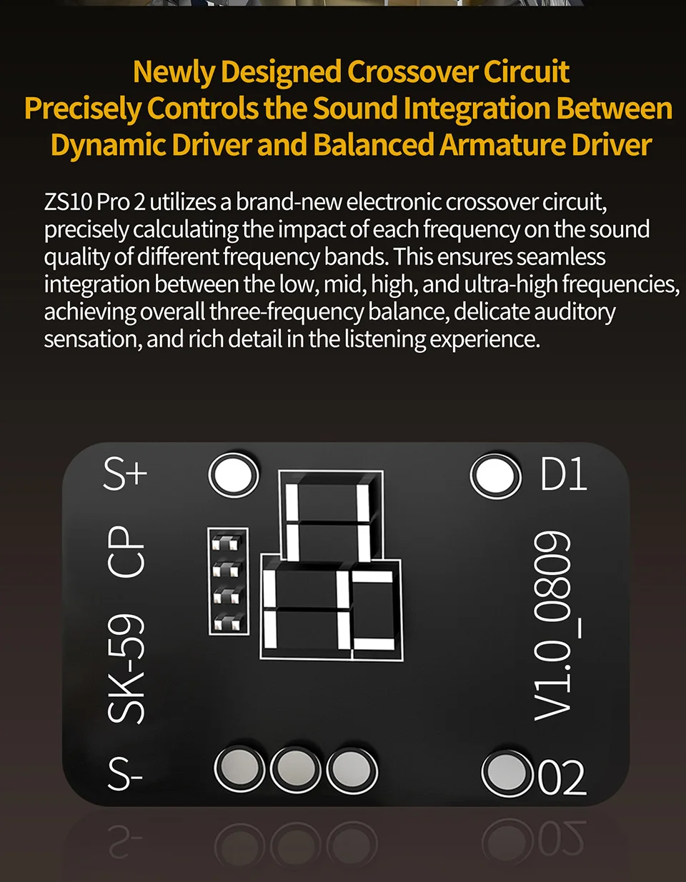 The ZS10 Pro 2 is equipped with an innovative electronic crossover circuit that expertly assesses and adjusts the impact of each frequency band, ensuring flawless harmony between the low, mid, high, and ultra-high frequencies. This precision engineering promotes a balanced sound across all three frequency ranges, enriching the listening experience with nuanced auditory sensations and intricate details.