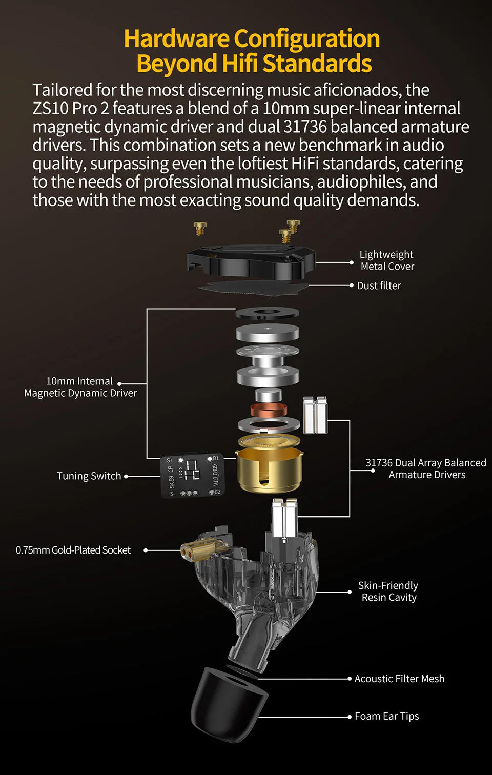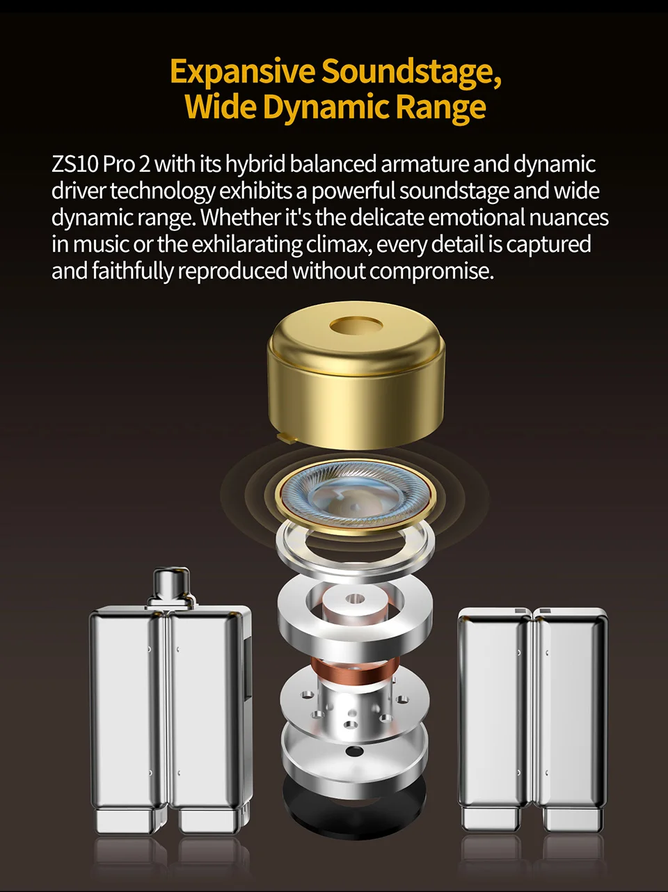 Tailored for the most discerning music aficionados, the ZS10 Pro 2 showcases a10mmsuper-linear magnetic dynamic driver paired with dual 31736 balanced armature drivers. This powerful combination redefines audio excellence, surpassing even the highest HiFi standards, and meets the precise demands of professional musicians and audiophiles. The custom-engineered 31736 balanced armature drivers excel in delivering high-frequency and ultra-high-frequency sounds, capturing every nuanced detail. Whether it's the richness of the details or the breadth of the dynamic range, the ZS10 Pro 2 delivers them with unparalleled accuracy.