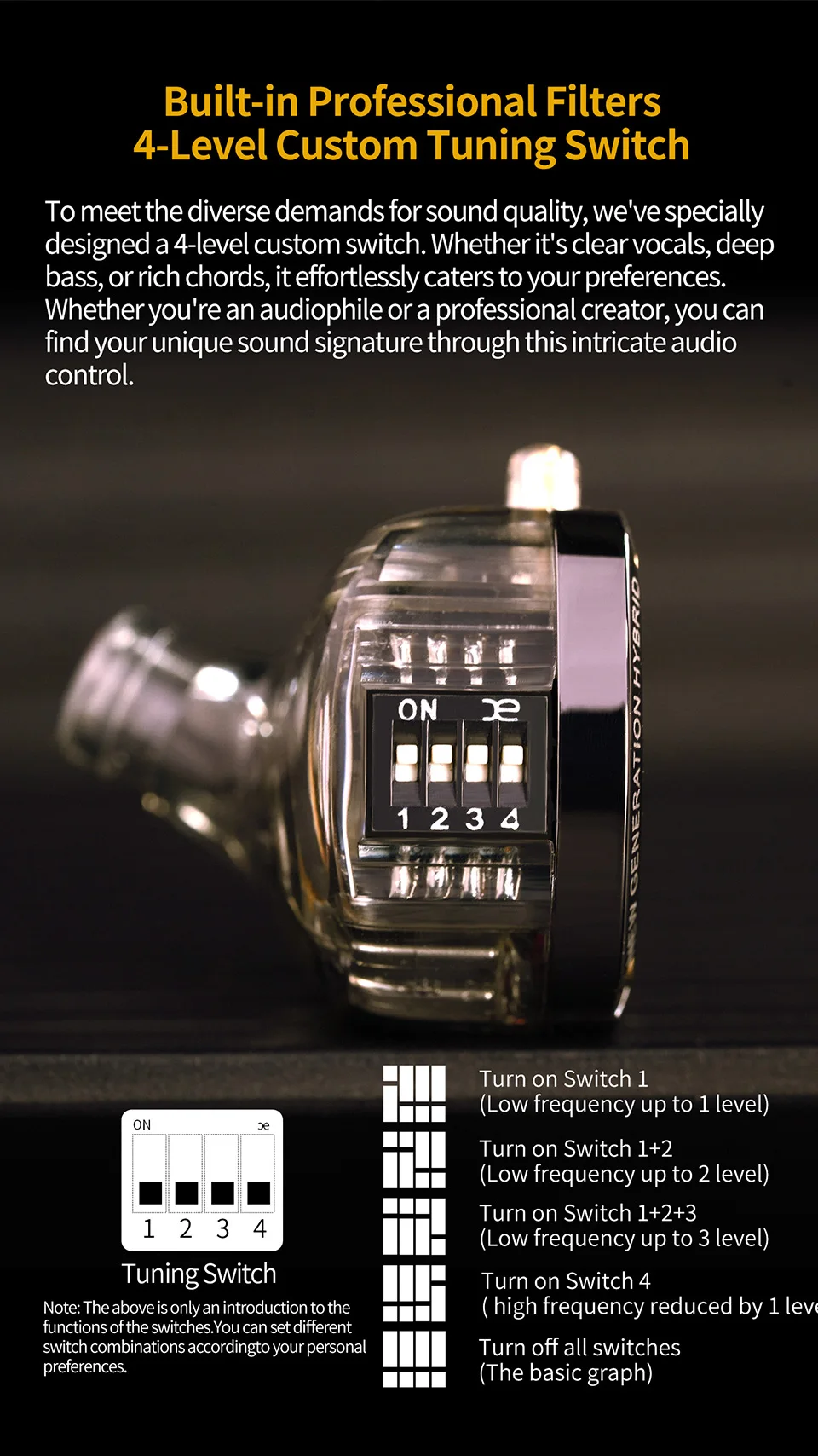 To accommodate a variety of sound preferences, the ZS10 Pro 2 features a 4-level custom tuning switch, expertly designed for detailed personalization. Whether you desire crystal-clear vocals, deep, resonant bass, or full, rich chords, this switch allows effortless adjustments to suit your audio tastes. Perfect for audiophiles and professional creators alike, this intricate control lets you define your unique sound signature with precision.