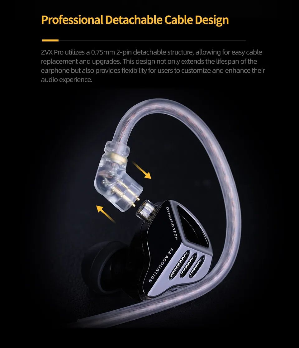 Designed with a professional 0.75mm 2-pin detachable structure, the ZVX Pro allows easy cable replacement and customization. This enhances longevity and flexibility, letting users tailor their audio experience to their preferences.