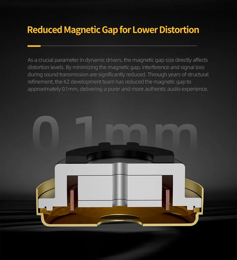 A key factor in dynamic driver performance, the magnetic gap size directly influences distortion levels. Through years of refinement, the KZ development team has minimized the magnetic gap to just 0.1mm, significantly reducing interference and signal loss for a purer, more authentic sound.