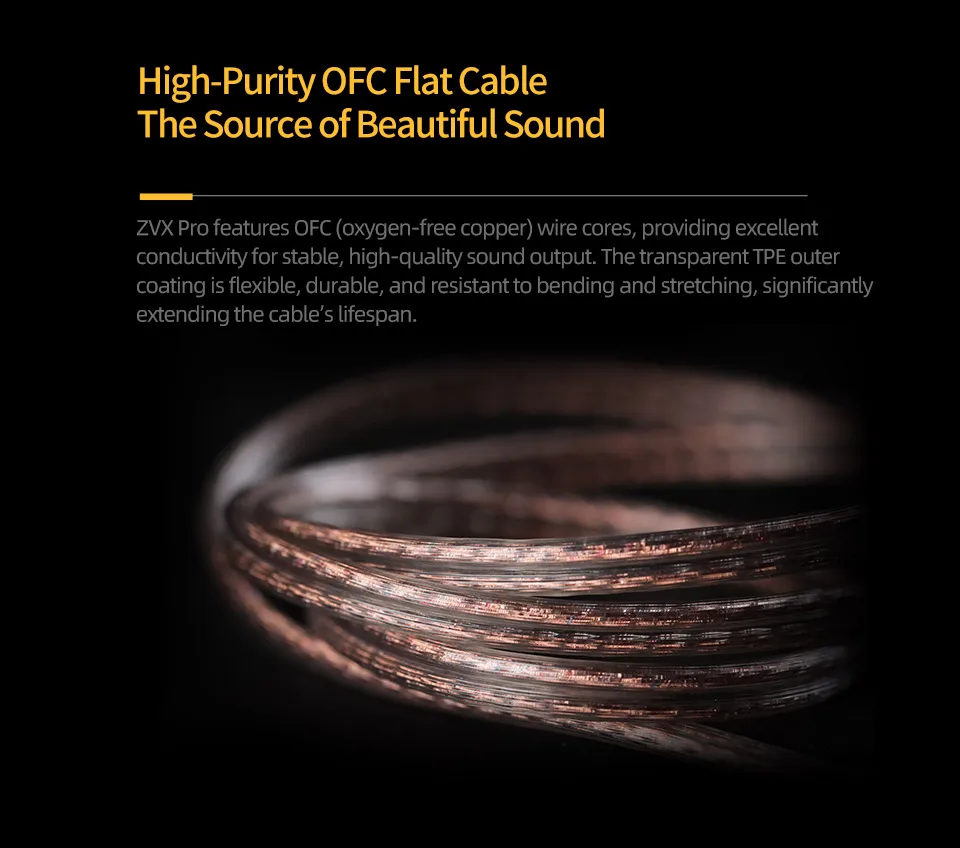 The ZVX Pro utilizes high-purity oxygen-free copper (OFC) wire cores to ensure stable, high-quality sound transmission. The durable transparent TPE outer coating is flexible, resistant to bending and stretching, and significantly extends the cable’s lifespan.