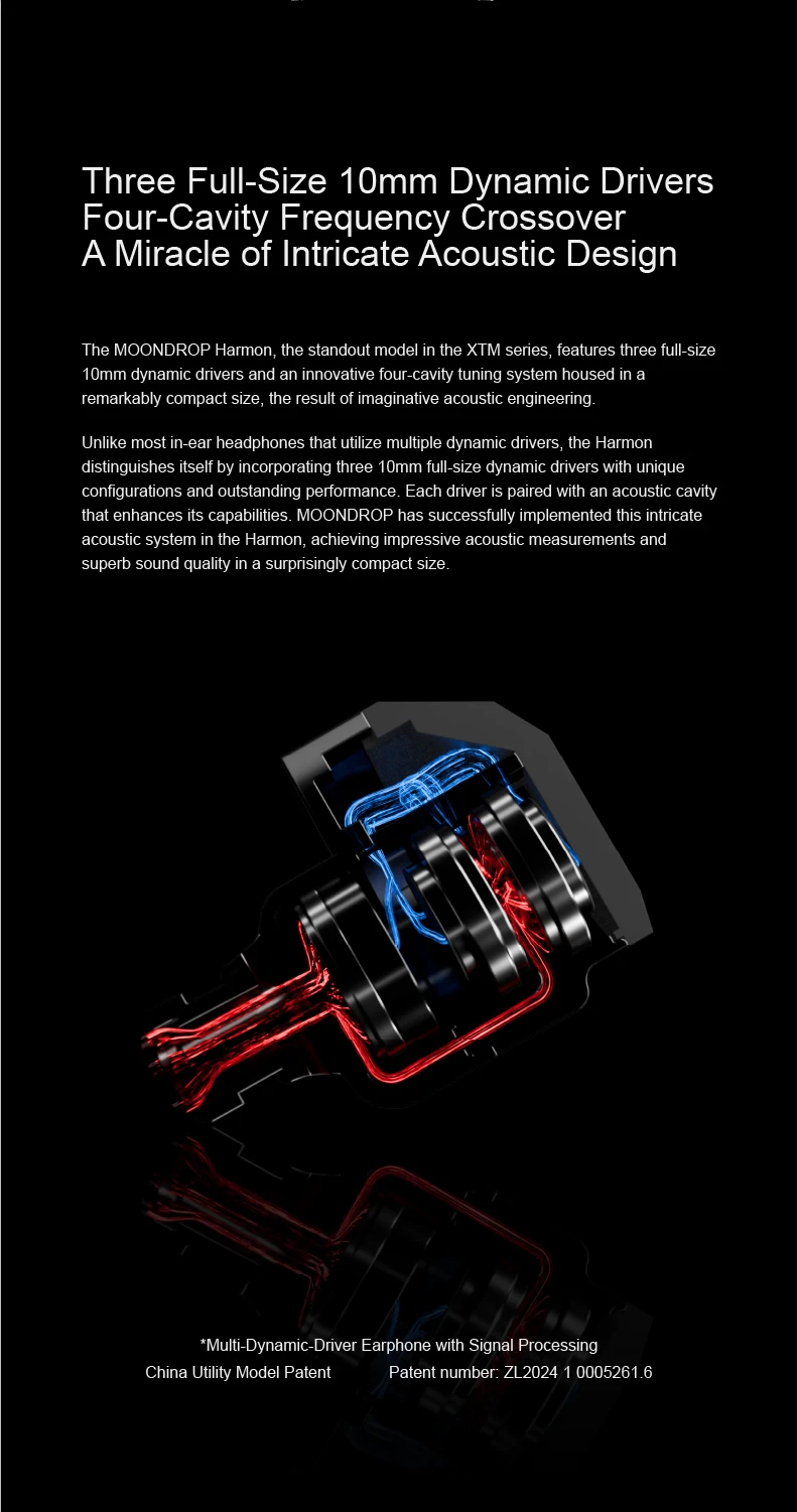 MOONDROP's XTM series introduces a pioneering approach to IEM crossover design. Breaking away from traditional styles, it opens a new path with bold experimentation and precision tuning. At the heart of this series lies the Harmon — a compact IEM with three full-size 10mm dynamic drivers and a patented coaxial four-cavity structure.