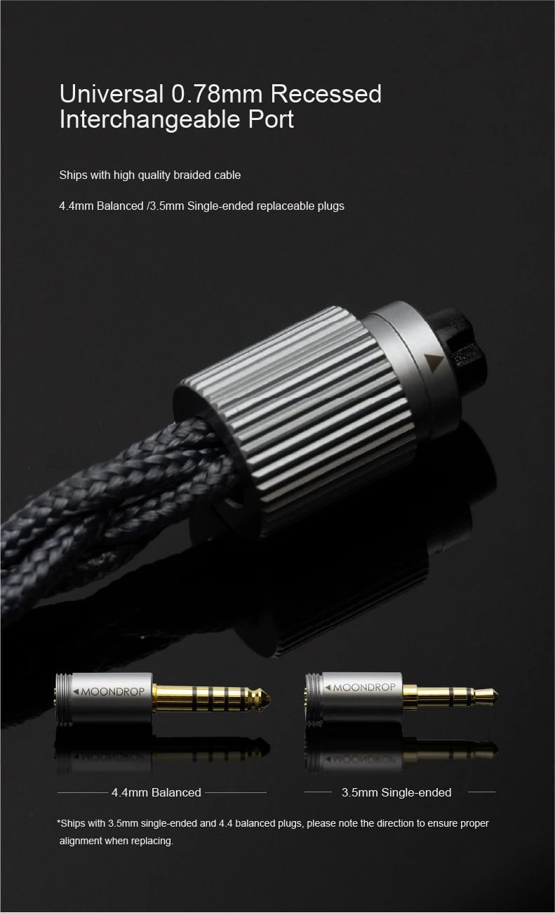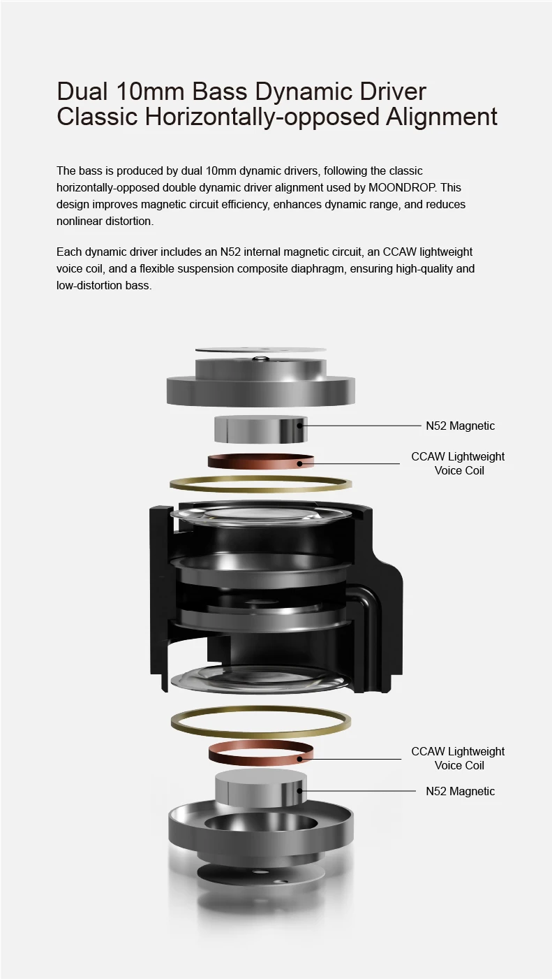 Bass is driven by MOONDROP’s signature horizontally-opposed dynamic driver layout, using dual 10mm units with N52 magnets, CCAW voice coils, and flexible paper-composite diaphragms. The result is deep, punchy, and distortion-free low-end performance.