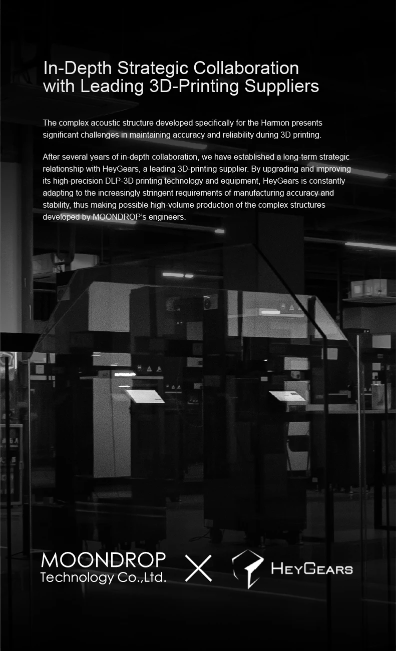 To realize its intricate internal structure, MOONDROP partnered with HeyGears, a leader in high-precision DLP 3D printing. This ensures manufacturing consistency for the Harmon’s complex shell while enabling mass production without sacrificing accuracy.