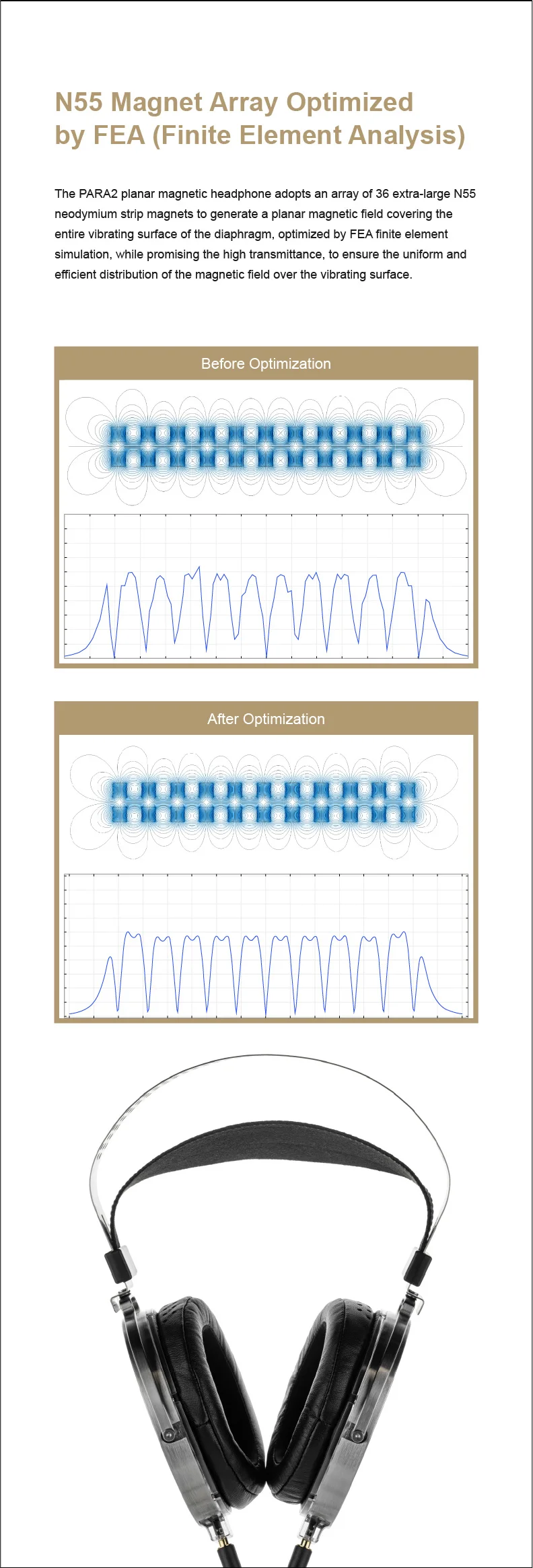 Utilizing 36 high-grade N52 neodymium strip magnets, the PARA II generates a uniform and powerful planar magnetic field. The layout is optimized by finite element analysis (FEA) for maximum field coverage and magnetic efficiency, ensuring precision control of the diaphragm's motion for high-resolution sound reproduction.