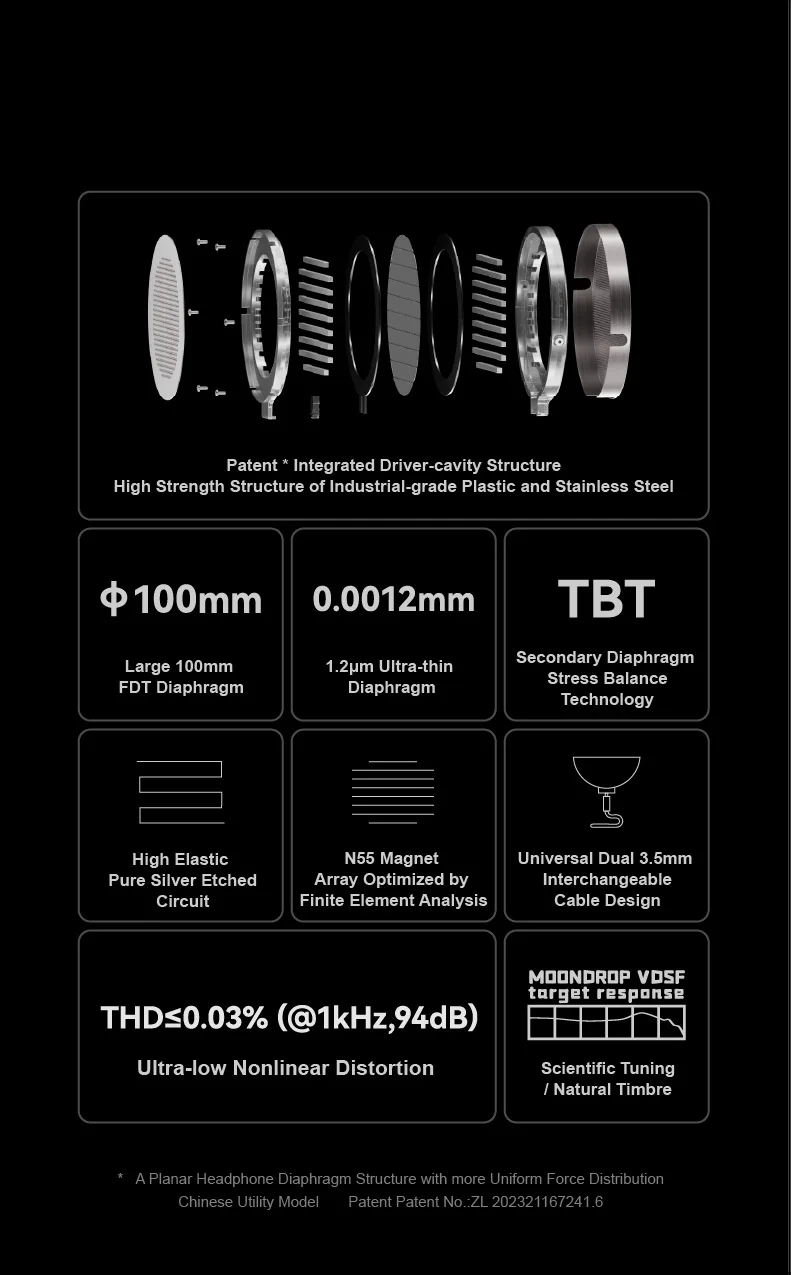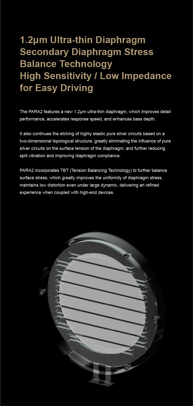With a cutting-edge 1.2μm ultra-thin diaphragm, pure silver etched circuits, and TBT (Tension Balancing Technology), the Para II maintains impressively low nonlinear distortion (THD ≤0.03%) even at high sound pressure levels. The result is ultra-fast response, exceptional low-end extension, and remarkable clarity across the frequency spectrum.