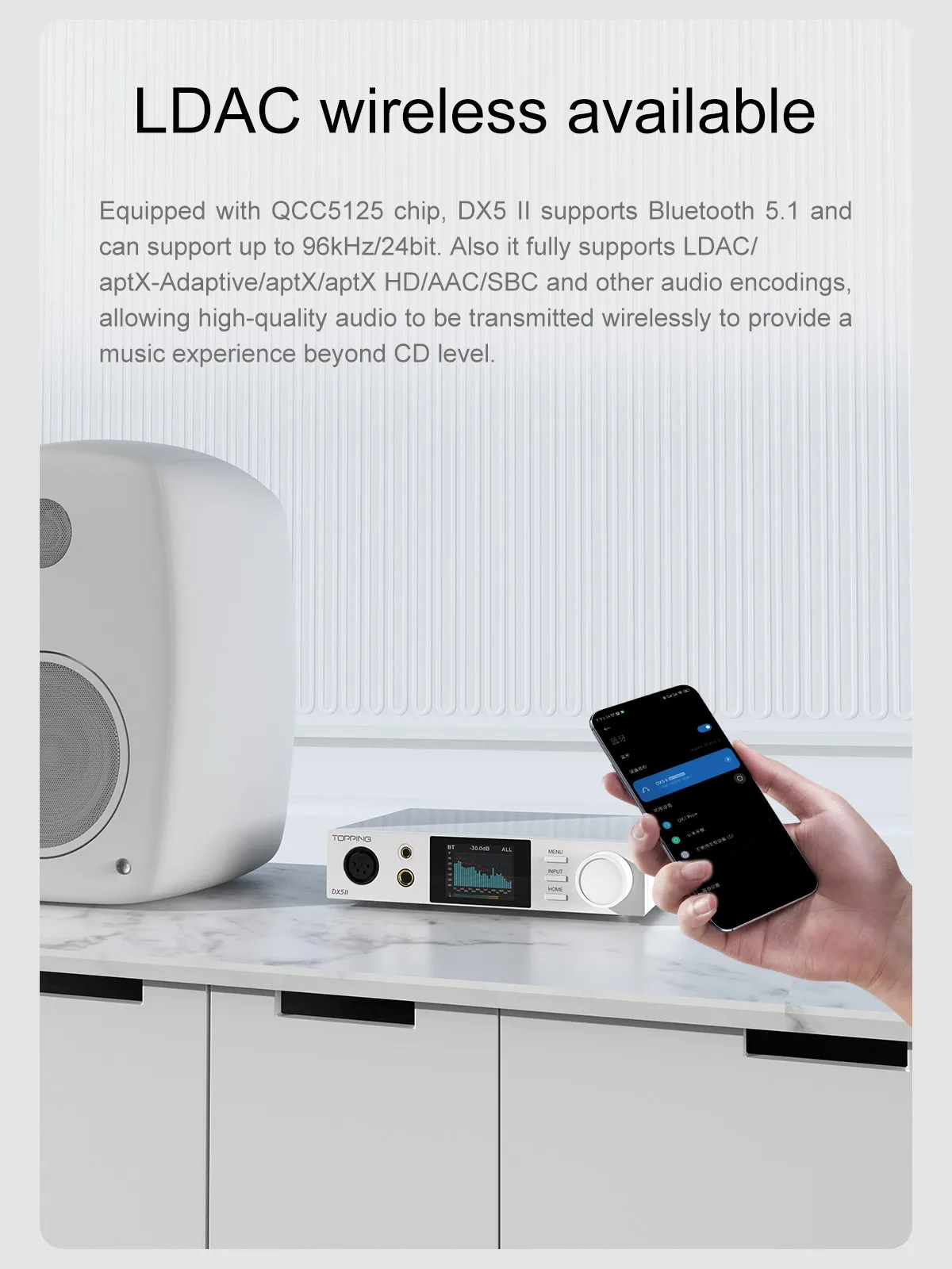 Powered by a QCC5125 chip, the DX5 II supports Bluetooth 5.1 with high-resolution wireless audio transmission. Enjoy playback up to 96kHz/24bit with full support for LDAC, aptX Adaptive, aptX HD, aptX, AAC, and SBC—delivering a wireless listening experience that rivals wired fidelity.