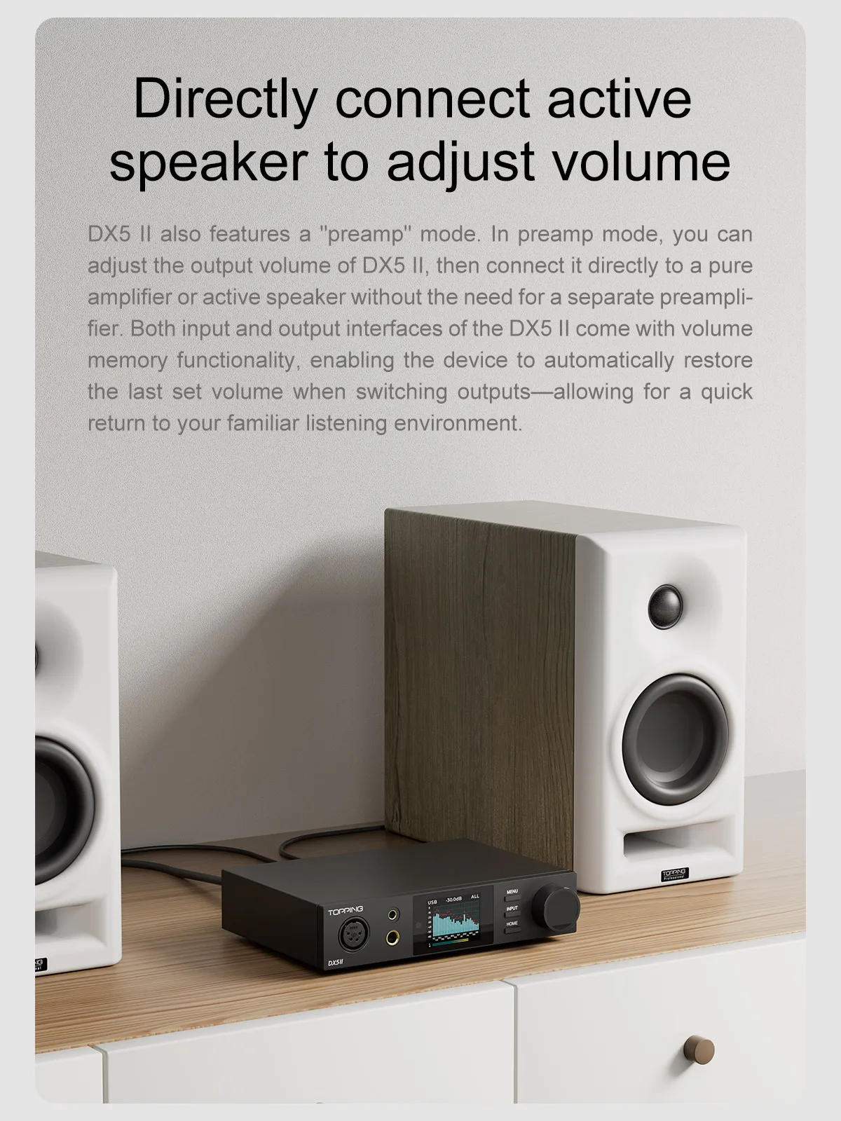 Activate preamp mode to control volume directly from the DX5 II when connecting to a power amplifier or active speakers—no external preamp needed. With volume memory for each input/output configuration, your listening settings are always just where you left them.