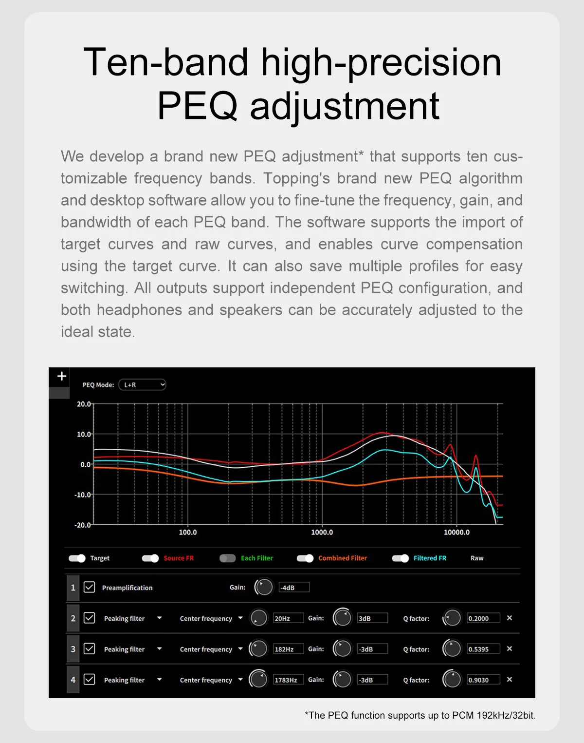 The DX5 II debuts TOPPING’s brand-new 10-band PEQ system, offering high-precision tuning of frequency, gain, and bandwidth for each band. With PC software support, users can import target curves, apply curve compensation, and save multiple presets. Independent PEQ profiles for headphone and line-out outputs allow you to dial in the perfect sound for any setup.