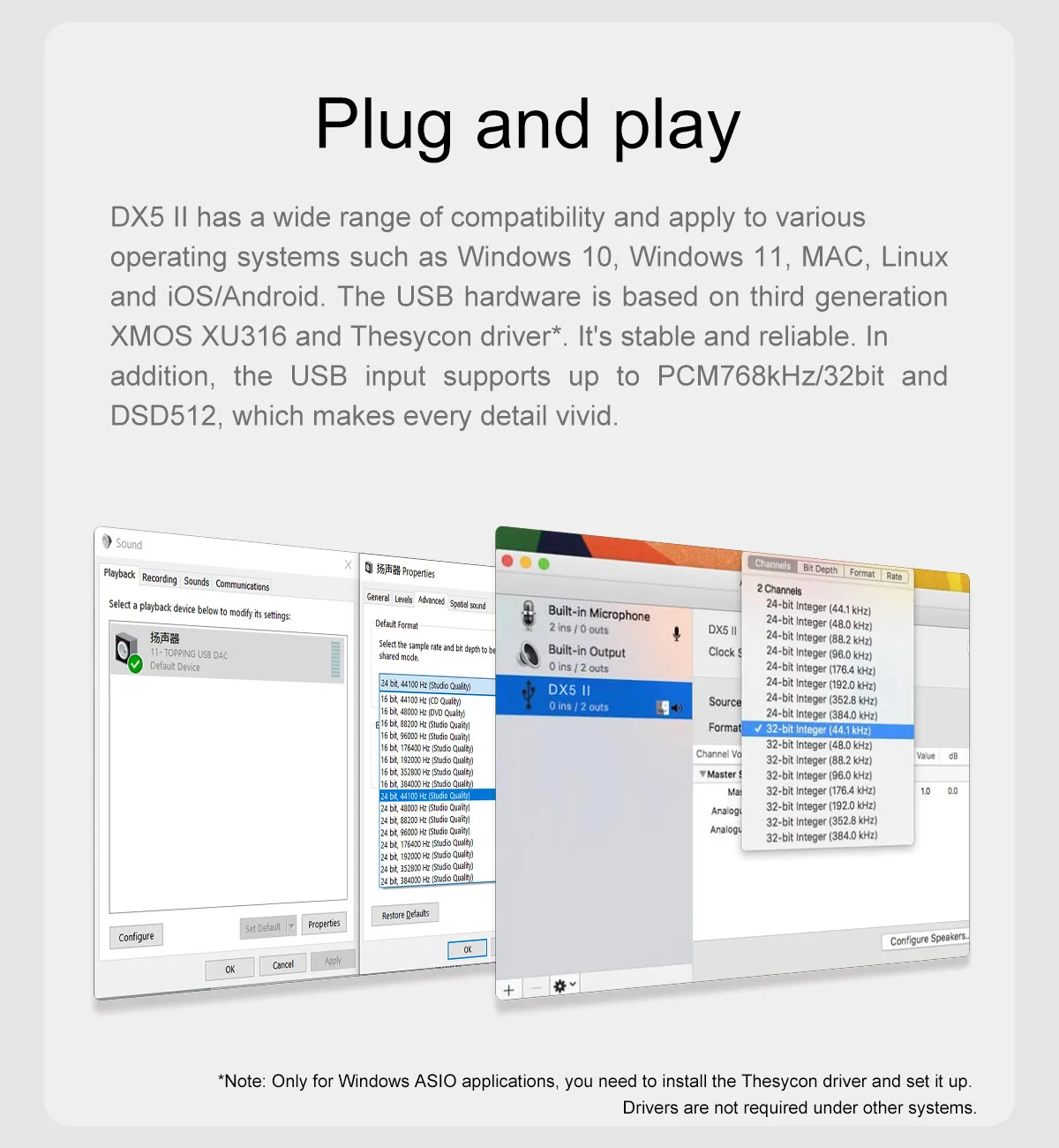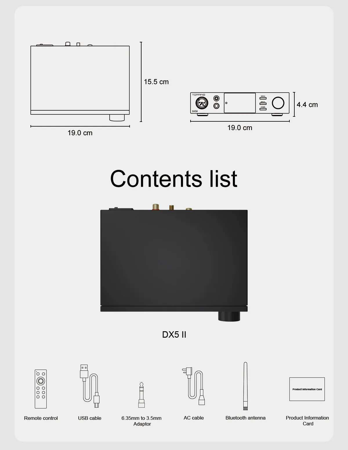 Compatible with Windows 10/11, macOS, Linux, iOS, and Android, the DX5 II features a third-gen XMOS XU316 USB interface with Thesycon drivers for stable and high-performance operation. USB input supports up to PCM 768kHz/32bit and DSD512, ensuring every detail is captured in your digital library.