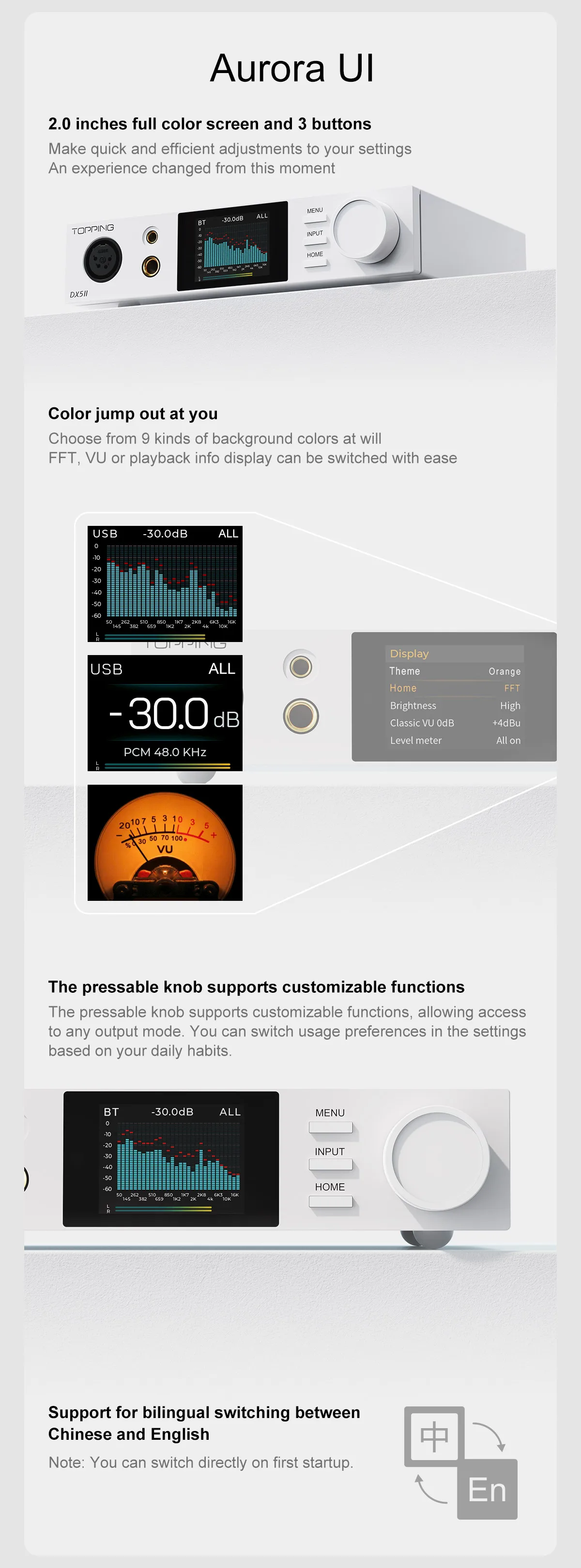 Navigate your settings effortlessly with the 2.0-inch full-color screen and three-button control layout. Choose from nine customizable background colors and display modes (FFT, VU meter, or playback info) to match your aesthetic. The pressable knob supports assignable functions, letting you switch output modes and tailor your listening experience with ease.