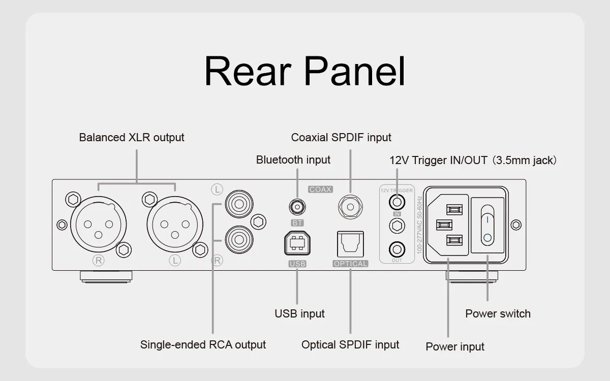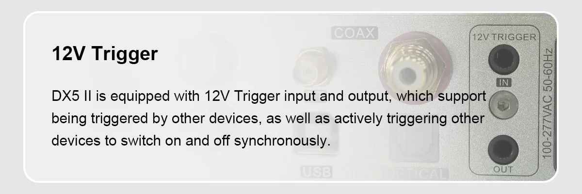 The DX5 II includes 12V trigger input and output ports, allowing it to power on or off in sync with other compatible devices, for seamless system integration.