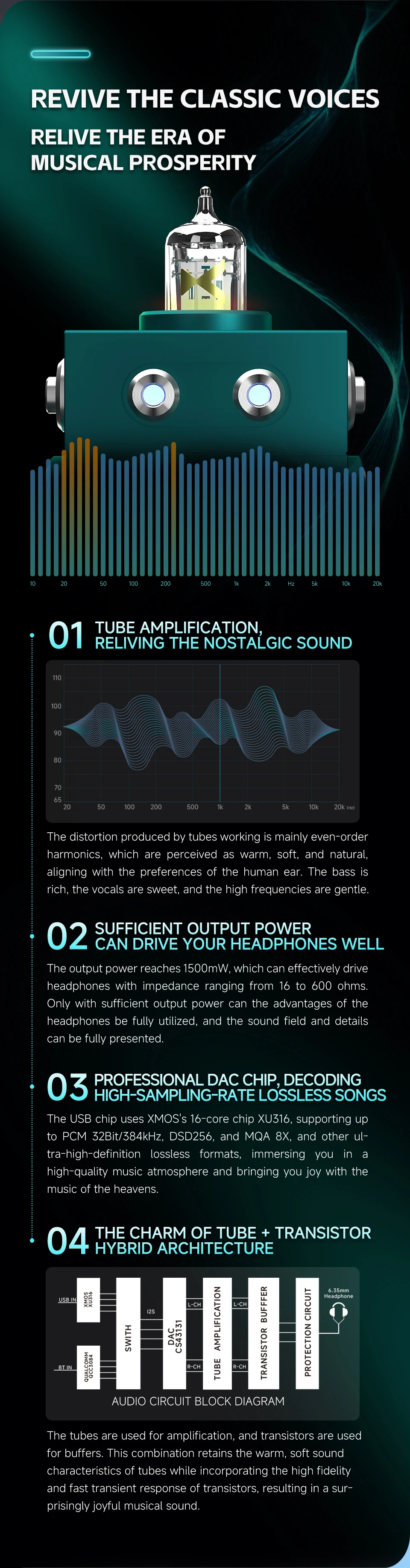 Experience the perfect synergy of tube amplification and transistor buffering, where the warm, soft sound of even-order harmonics meets the precise, rapid response of modern circuits. With up to 1500mW of output power, it effortlessly drives headphones from 16 to 600 ohms, ensuring every subtle detail comes alive. Equipped with XMOS’s 16-core XU316 chip, it supports PCM 32Bit/384kHz, DSD256, and MQA 8X, delivering an ultra-high-definition listening experience. Embrace the timeless nostalgia of tubes blended with the clarity of transistors—a surprisingly joyful musical encounter awaits.