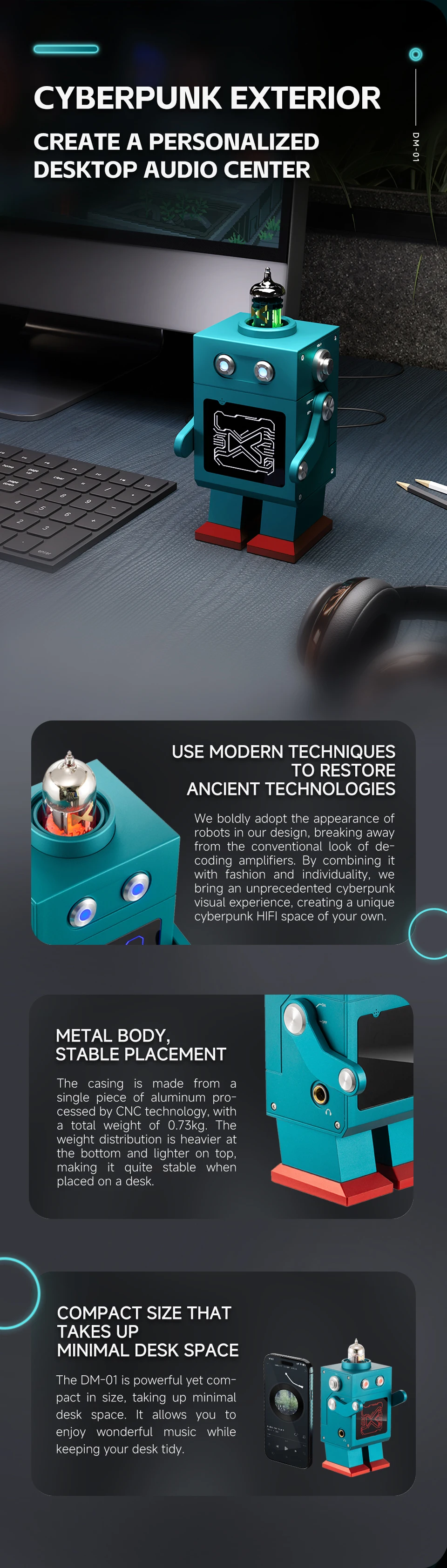 xDuoo DM-01 redefines conventional decoder amplifiers with its futuristic, robot-inspired design and sleek cyberpunk aesthetic. Crafted from a single CNC-machined aluminum block, its metal body not only exudes durability but also features a stable, well-balanced weight distribution for secure desktop placement. Despite its powerful performance, the DM-01 remains impressively compact, keeping your workspace tidy while delivering an unmatched HiFi experience.