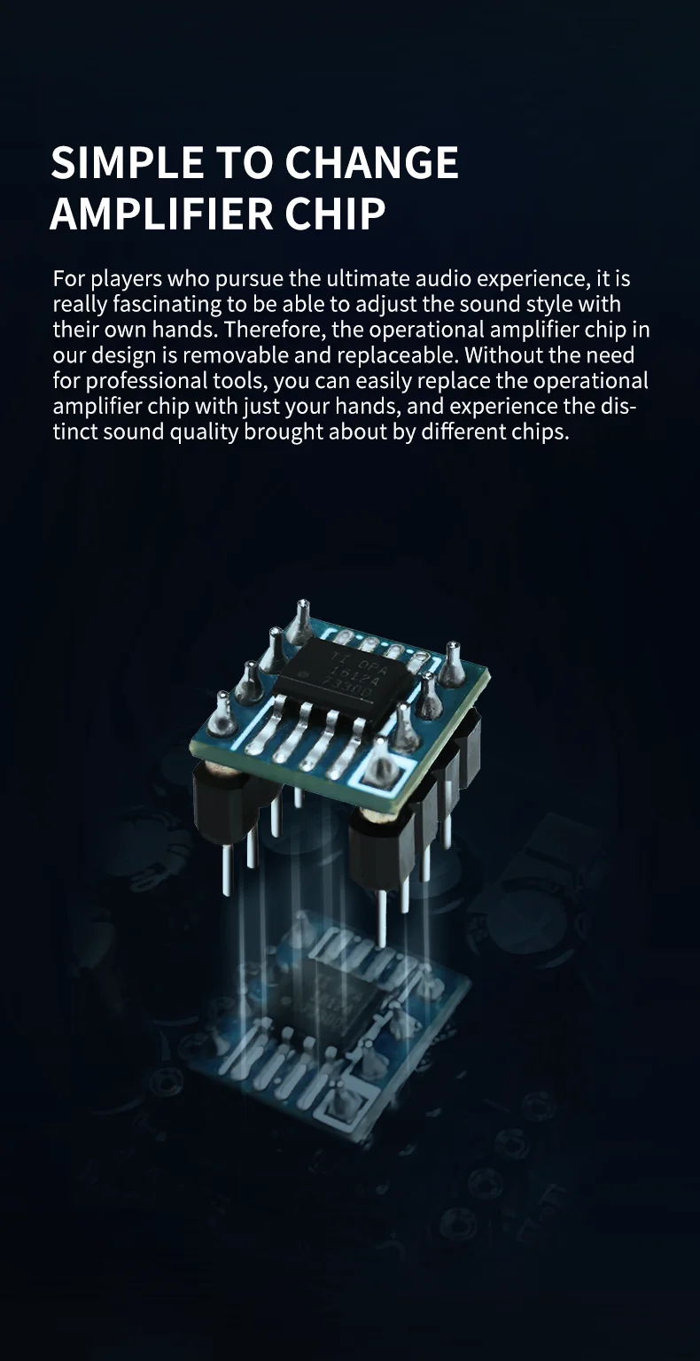 For those who like to customize their sound, the operational amplifier (op-amp) chip is user-replaceable—no specialized tools required. Swap chips by hand to explore different tonal characteristics and tailor your listening experience.