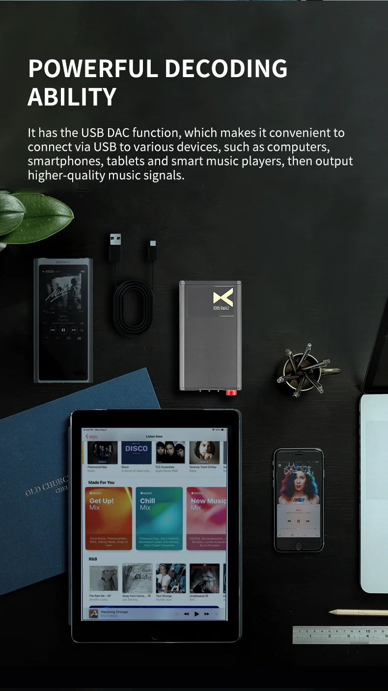 Whether you’re at home, in the office, on a business trip, or traveling, the XD05 BASIC2 is extremely portable. Its compact design lets you enjoy high-quality music anywhere and anytime.