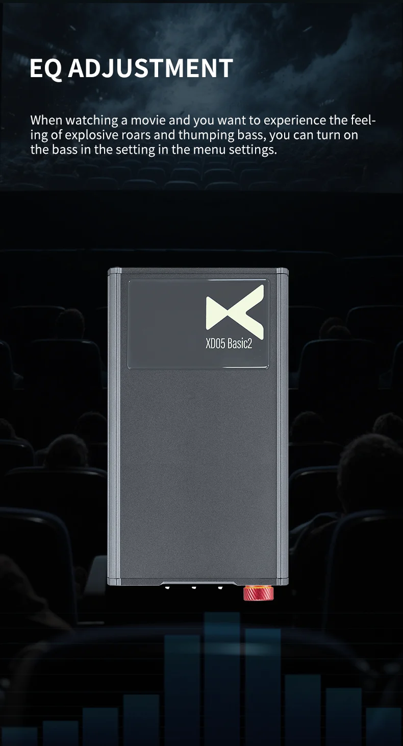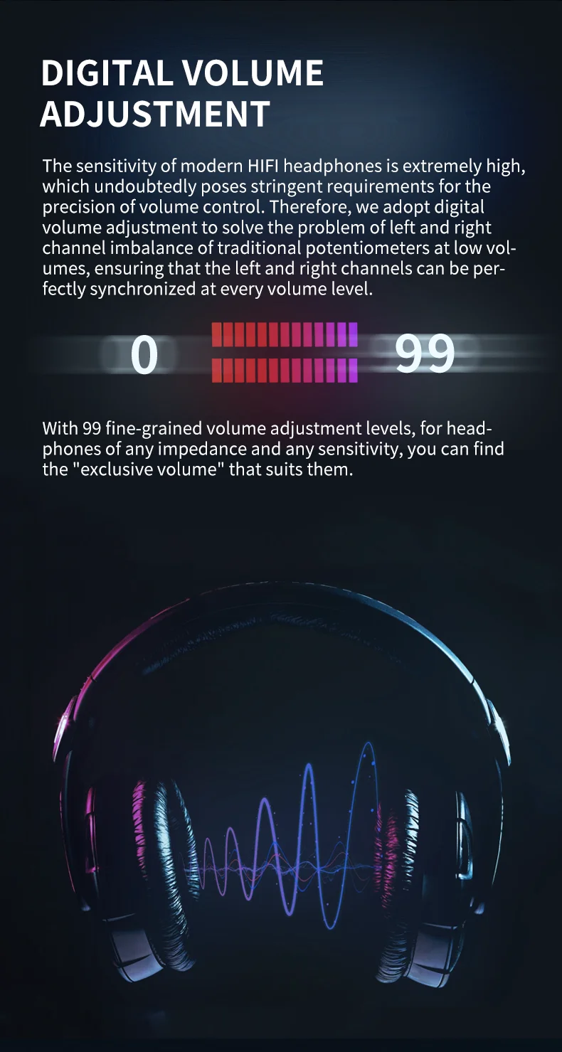 Modern Hi-Fi headphones demand precise volume control. The XD05 BASIC2 uses digital volume steps—eliminating left/right imbalance at low volumes inherent in traditional potentiometers. With 99 fine-grained levels, you can find the perfect setting for any headphone impedance or sensitivity.