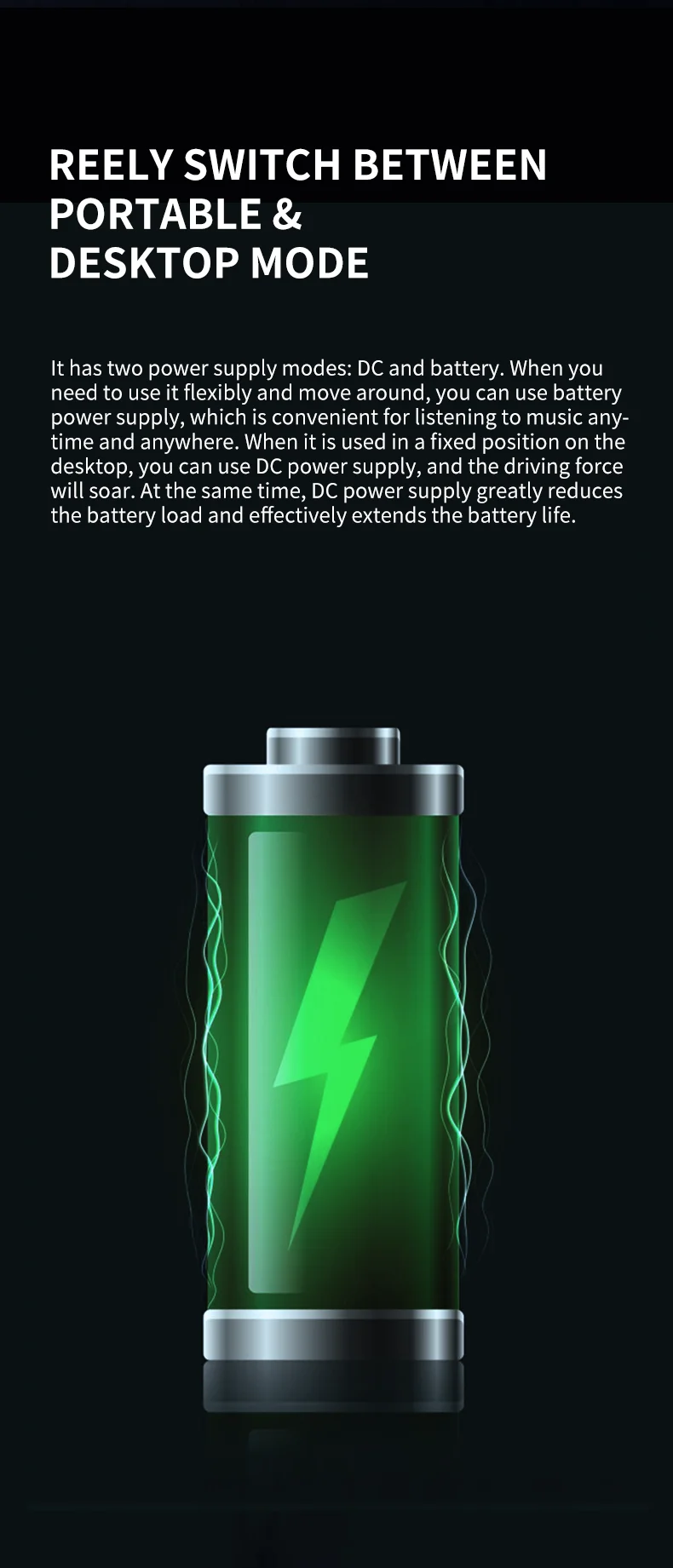 Choose between battery power for on-the-go listening or DC power for stationary use. Desktop (DC) mode boosts driving force while reducing battery strain, effectively prolonging playback time when you’re not moving around.
