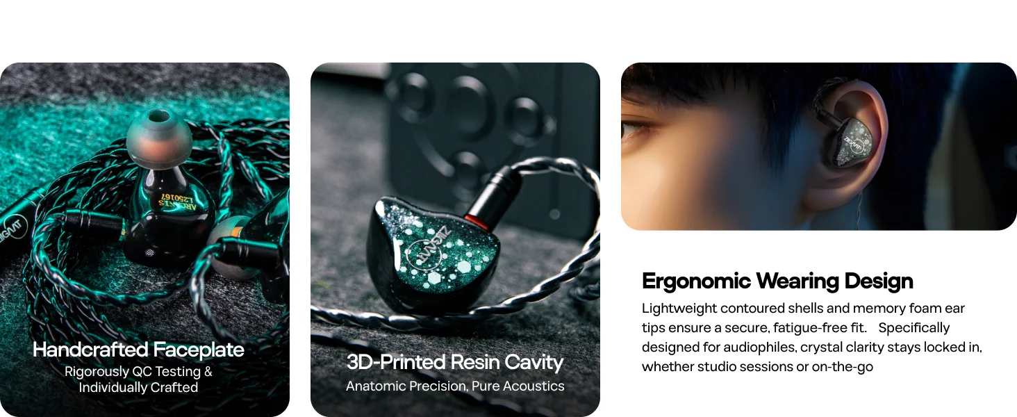 Each Arcanis unit is constructed from 3D printed medical-grade resin. The faceplates are individually hand painted and paired before assembly. Each unit is hand assembled, paired, and undergoes an individual QC process to check the sound, craftsmanship, and packaging.