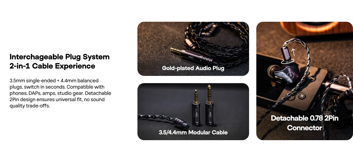 The Crescent comes standard with an interchangeable 2-pin 0.78mm connector cable. The cable is constructed from ultra-pure grade silver-plated oxygen-free copper. Premium silver-plated copper wires ensure noise-free signal transmission for the highest quality of sound. The interchangeable cable design also optimizesthe longevity of the IEM and allows customizability in your wearing experience.