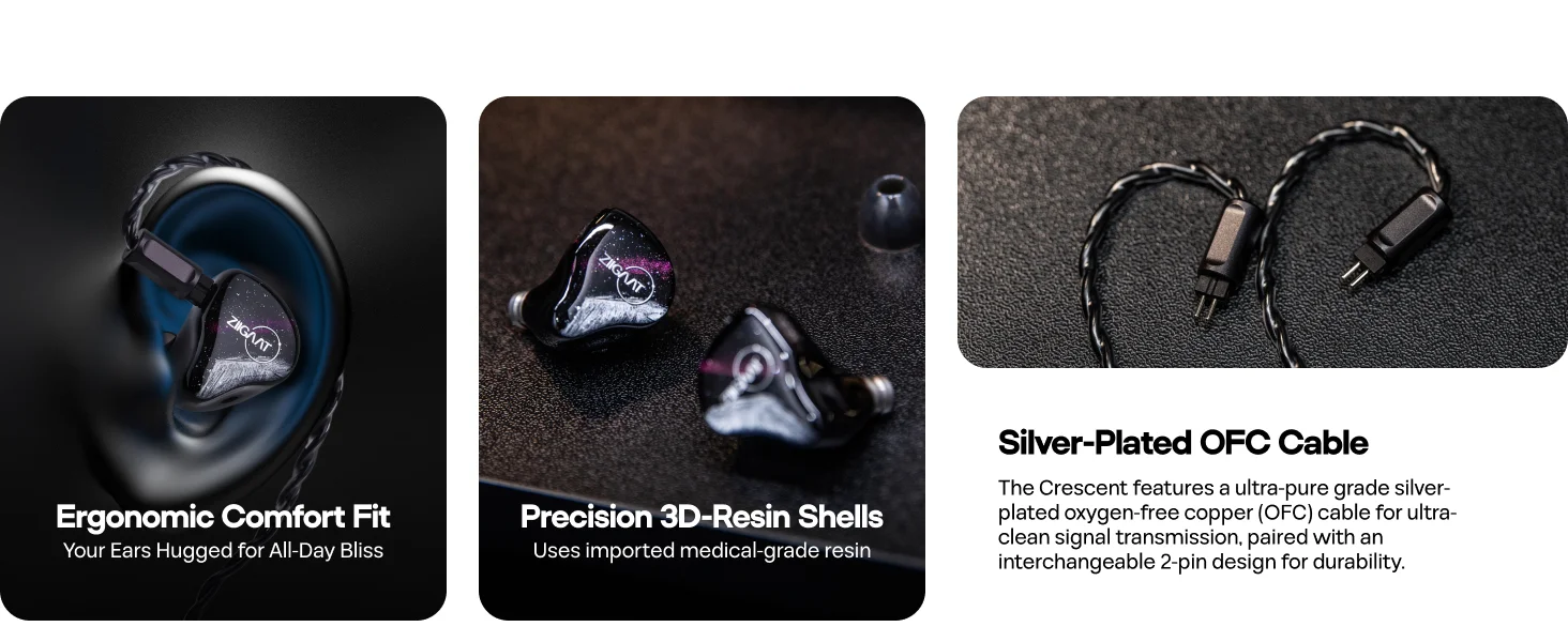 The secret to making the unique texture of the Crescent feel crisp is the tuning. The Crescent has been painstakingly tuned to fit ZiiGaat’s in-house tonal curvature. Featuring a robust 10dB sub-bass shelf that exactly cuts off at 250Hz, the bass is thumpy, focused, and pristine. The midrange are free-from any bloating, allowing vocals and instruments to sound accurate, showcase their inherent warmth, and texture. The trebles have excellent bite and sizzle without any harshness thanks to a natural decay curvature. Micro peaks throughout the decay brings out every minute detail that keeps the sound feeling clear and full of air without being unnatural.